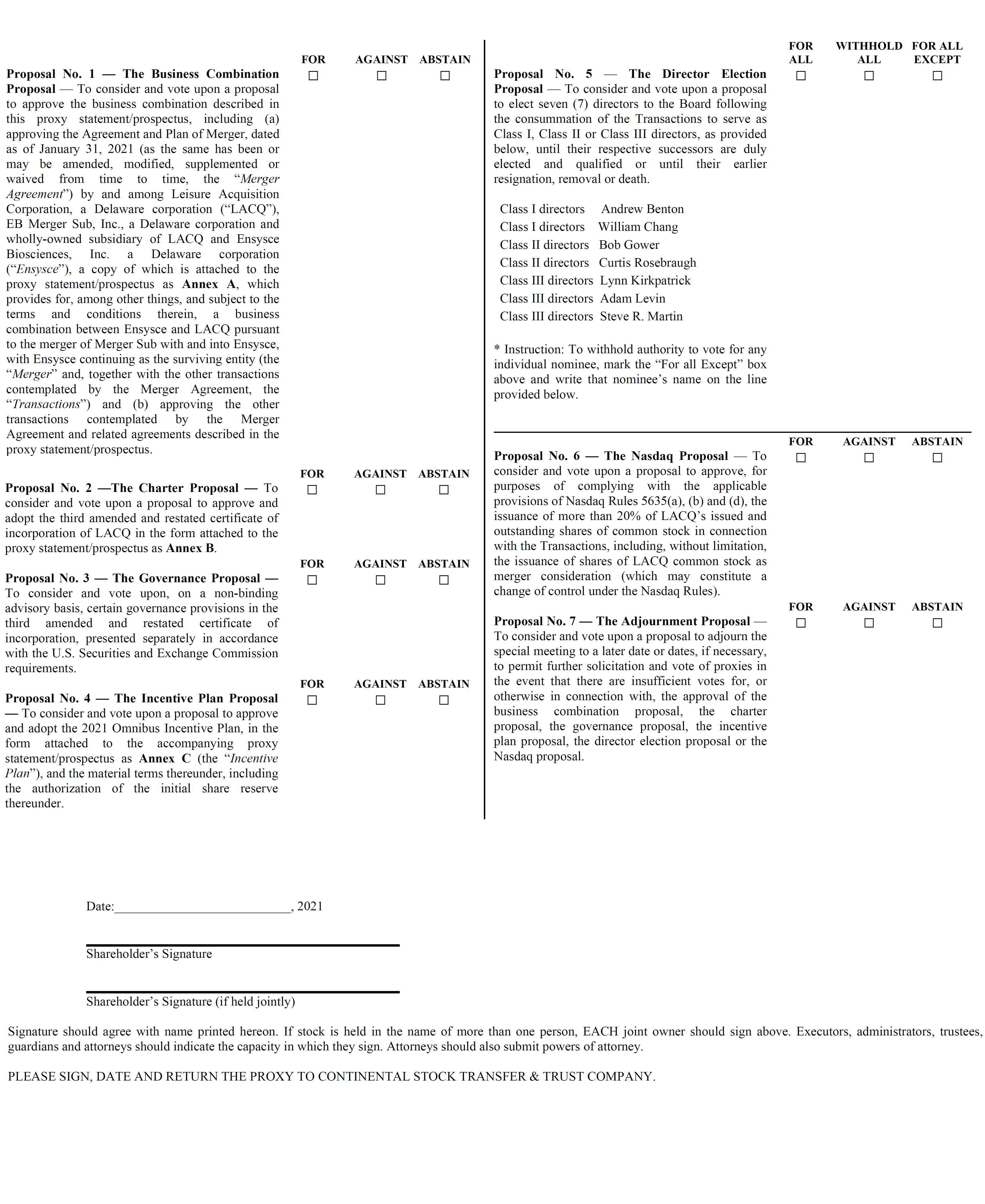 Important Notice Regarding the Availability of Proxy Materials for the Special Meeting to be held on [ ], 2021: The Notice of Special Meeting and Proxy Statement are available through the Investors link of the Company’s website at www.leisureacq.com.